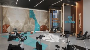 Fitnessstudio innen und außen, Sauna, Dampfbad, Yoga-Zonen